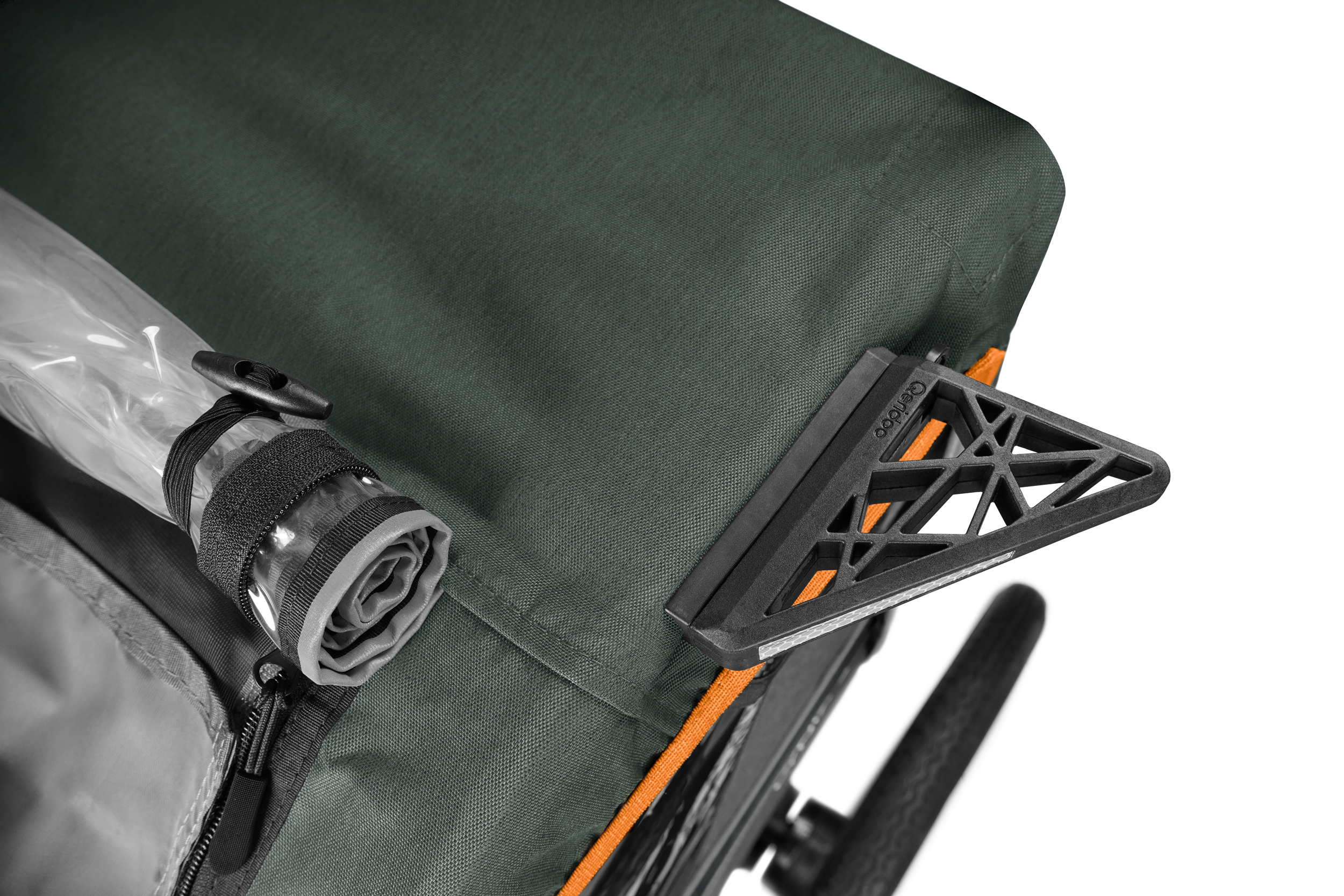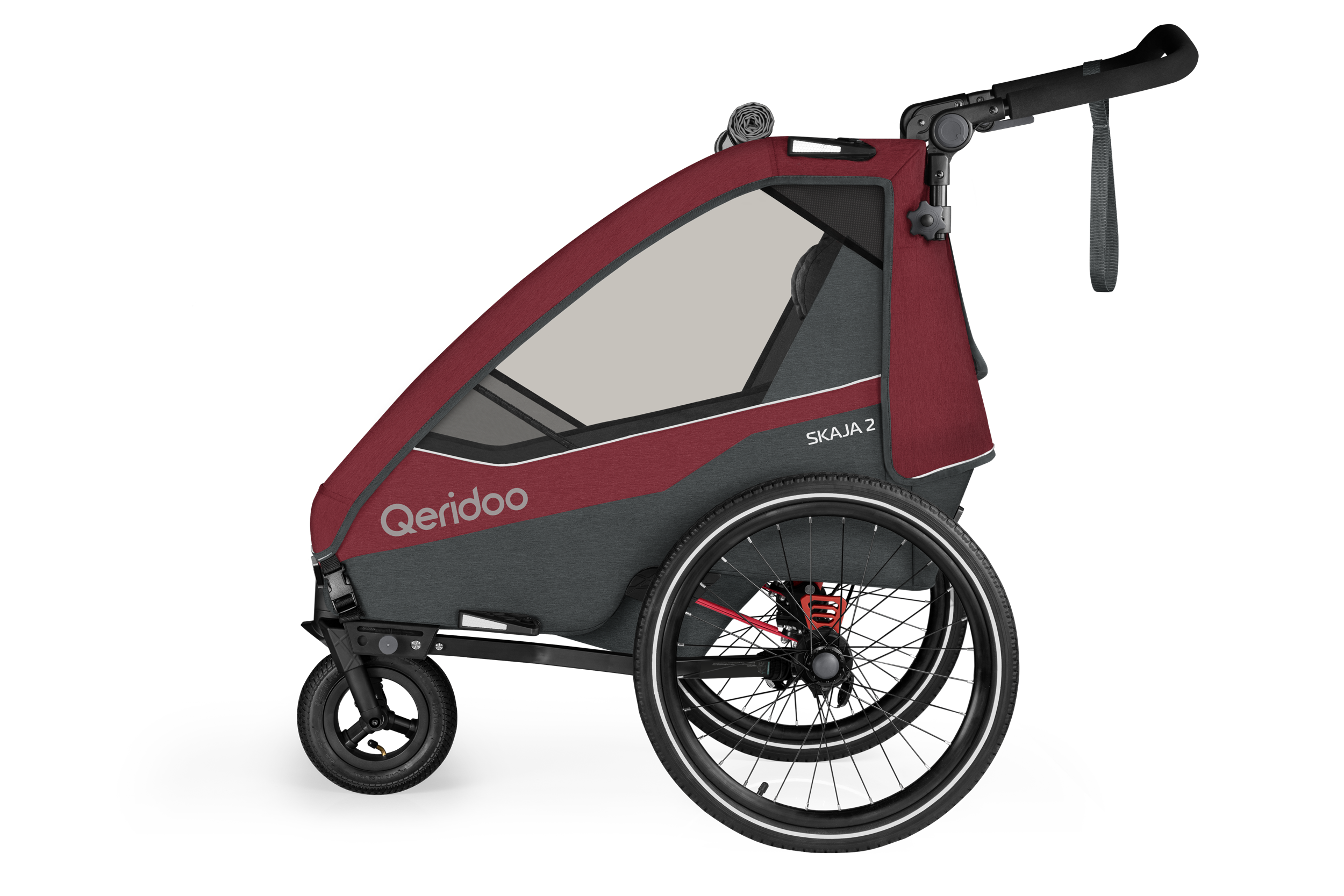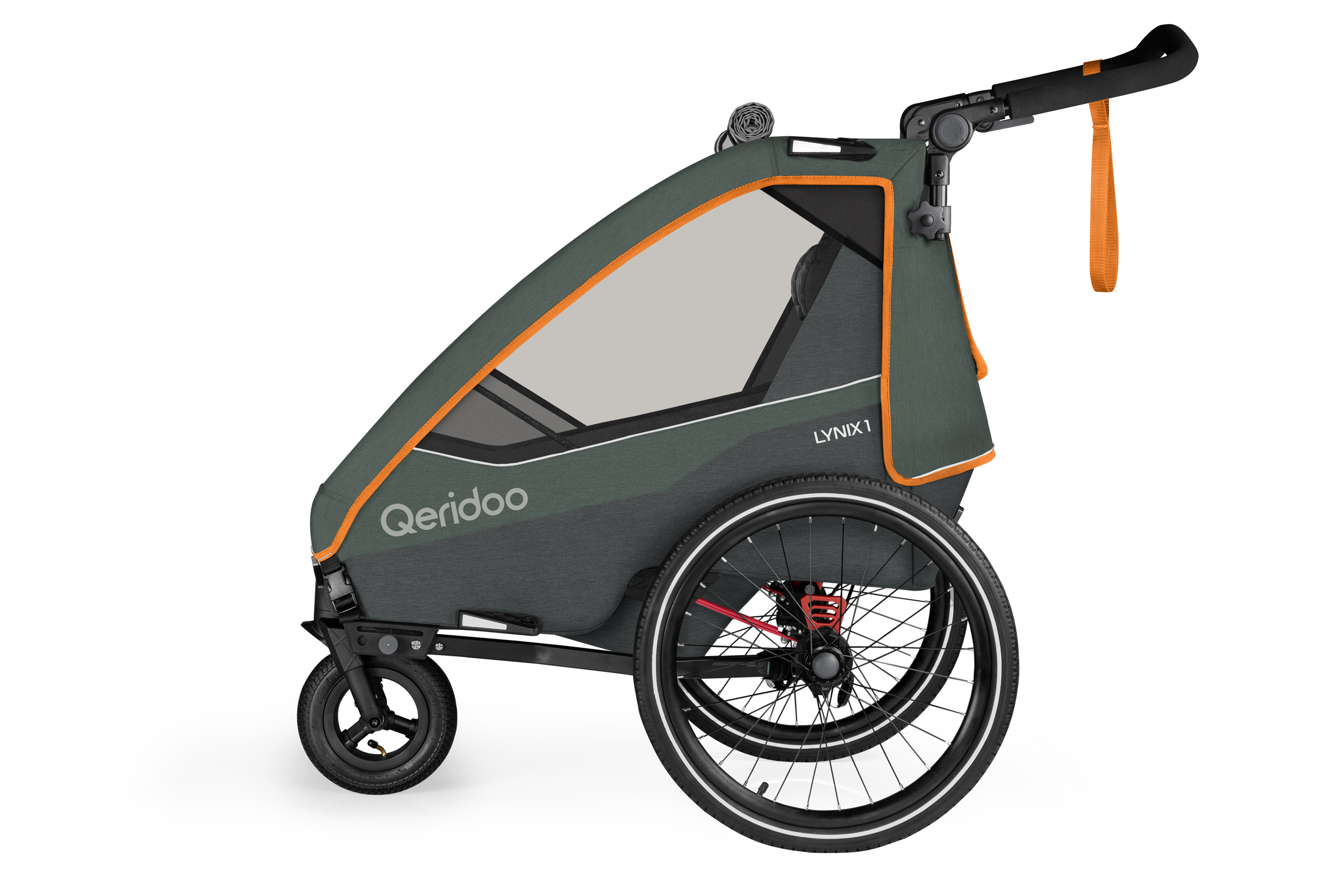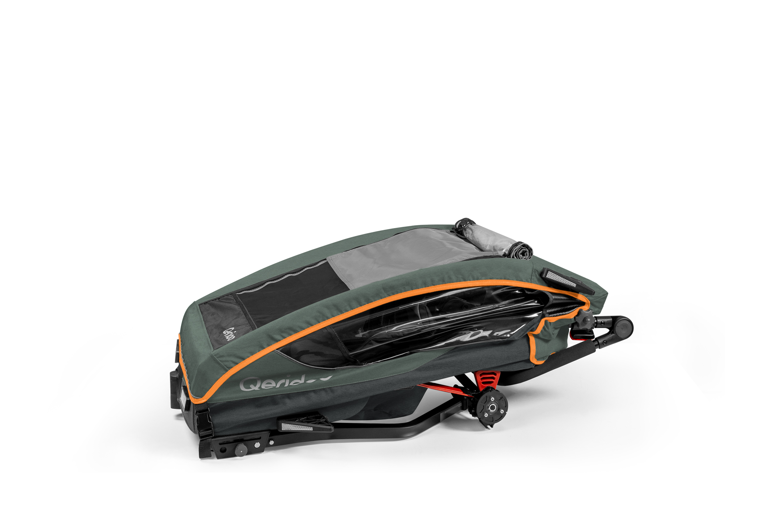 Die mitführbare Deichsel ist griffbereit unter der Kabine verstaut, sodass sich Dein Qeridoo jederzeit mühelos an Dein Fahrrad oder E-Bike anhängen lässt. -