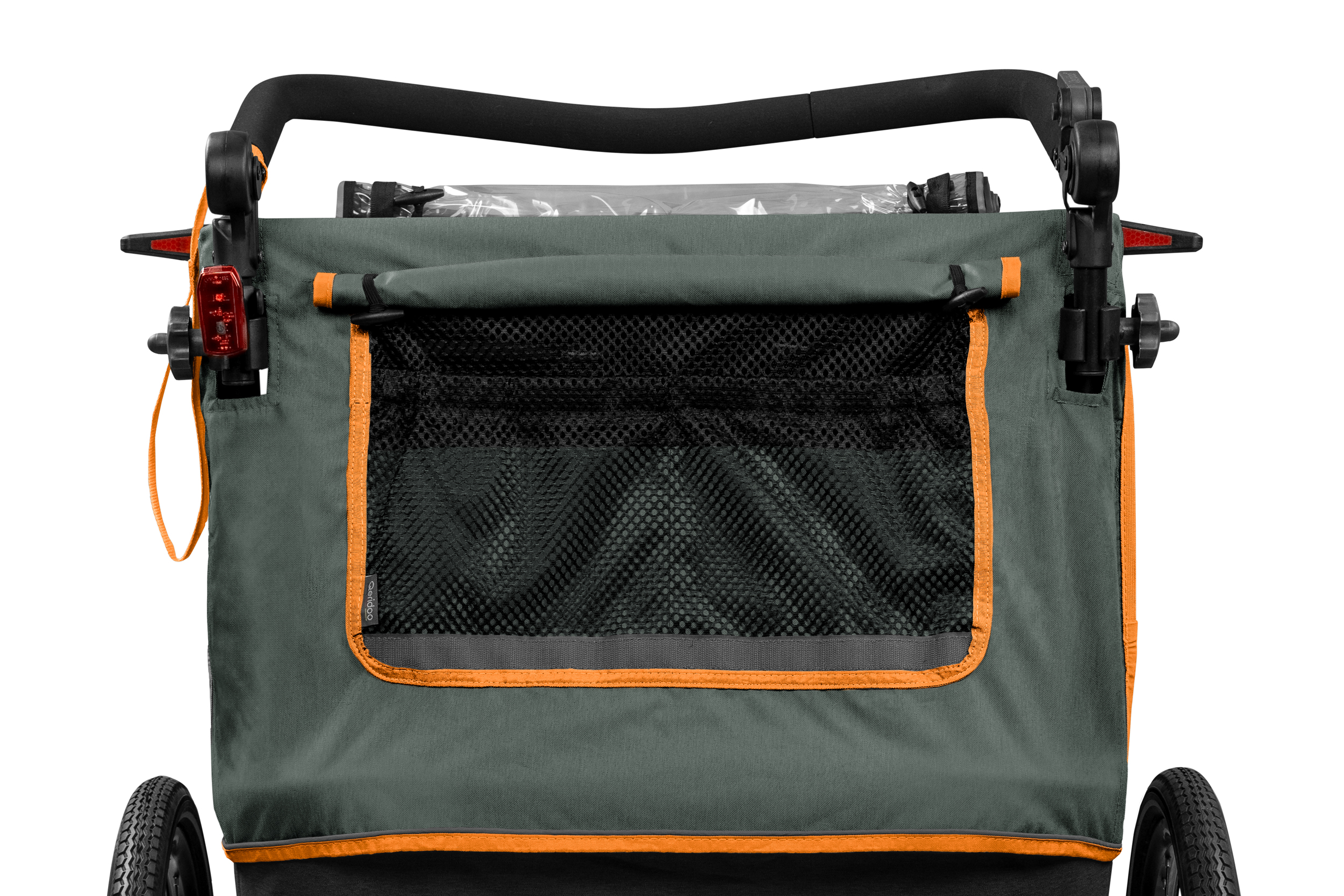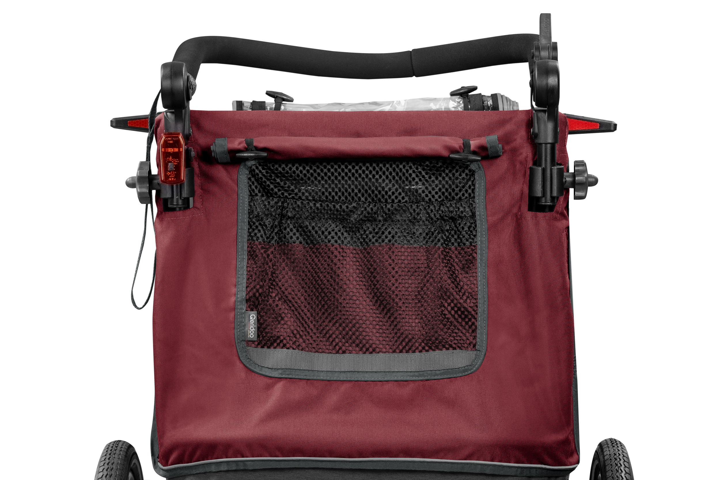 Rundum sichtbar: Reflektoren vorne, hinten, an den Rädern und im Stoffdesign – plus Sicherheitswimpel und Rücklicht